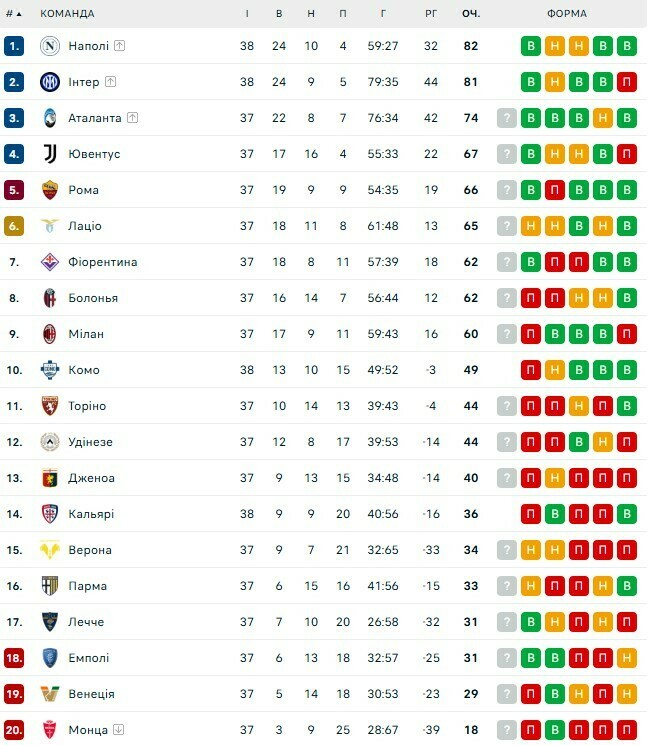 «Наполи» набрал 82 очка и стел победителем в чемпионской гонке с «Интером» (81), который переиграл «Комо» (2:0).