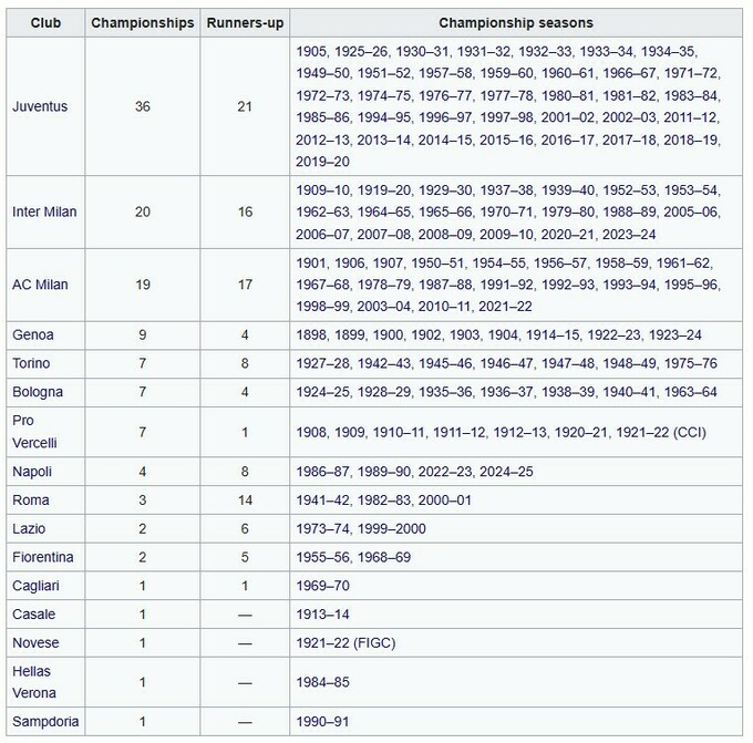 Все обладатели трофеев в чемпионатах Италии: Ювентус (36 титулов), Интер (20), Милан (19), Дженоа (9), Торино, Болонья, Про Верчелли (по 7), Наполи (4), Рома (3), Лацио, Фиорентина (по 2), Кальяри, Казале, Новезе, Верона, Сампдория (по 1).