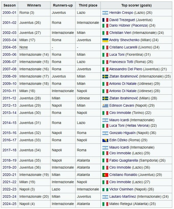 Победители, призеры и лучшие бомбардиры Серии A в XXI столетии