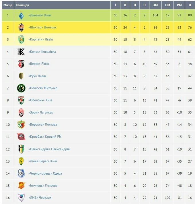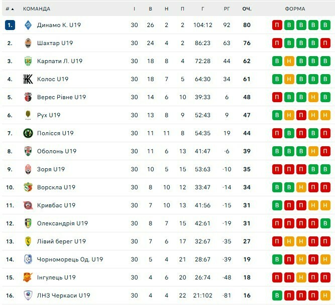 В итоговой таблице чемпионата Украины U-19 на первом месте – «Динамо» (80 очков), второе место занял «Шахтер» (76), а бронзовые медали достались «Карпатам» (62).