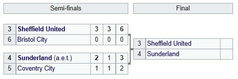 В полуфиналах Шеффилд Юнайтед переиграл Бристоль Сити (3:0, 3:0), а Сандерленд нанес поражение Ковентри (2:1, 1:1 д.в).