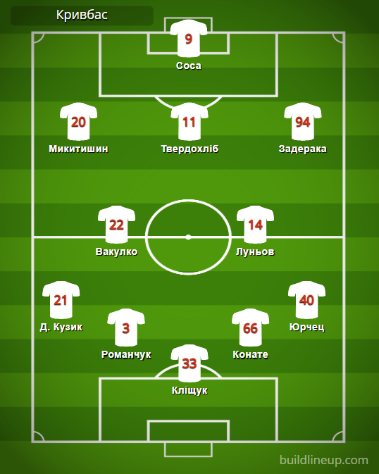 «Кривбасс»: Клищук – Д. Кузык, Романчук, Конате, Юрчец – Вакулко, Лунев (Илич, 58) – Микитишин (Ндомбази, 84), Твердохлеб (Гонсалез, 70), Задерака – Соса.
