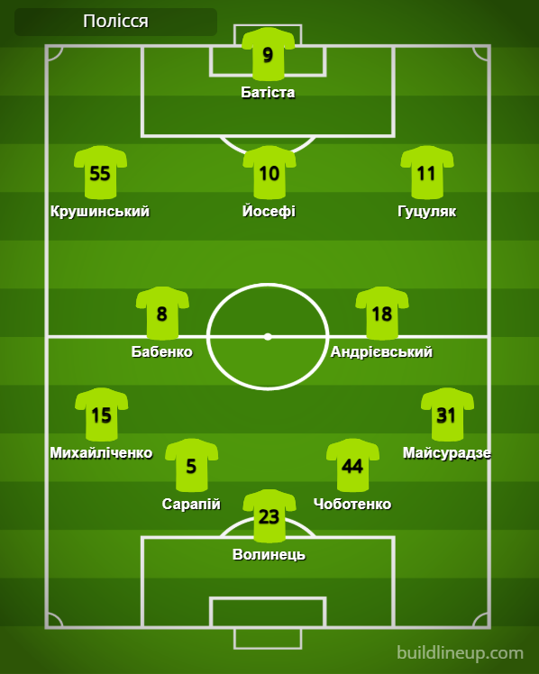 «Полесье»: Волынец – Михайличенко, Сарапий, Чоботенко, Майсурадзе (Виале, 90+4) – Бабенко, Андриевский – Крушинский (Таллес, 82), Йосефи (Караман, 62), Гуцуляк – Батиста (Леднев, 82).