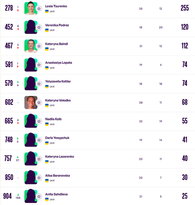 А вот Марта Костюк прибавила одну строчку. Теперь Марта занимает 25-ю строчку.