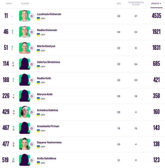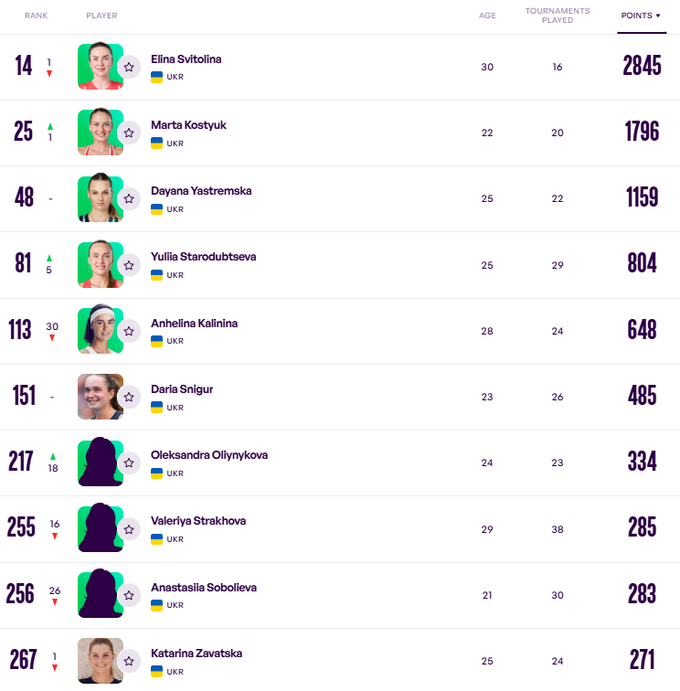 Украинки в рейтинге WTA