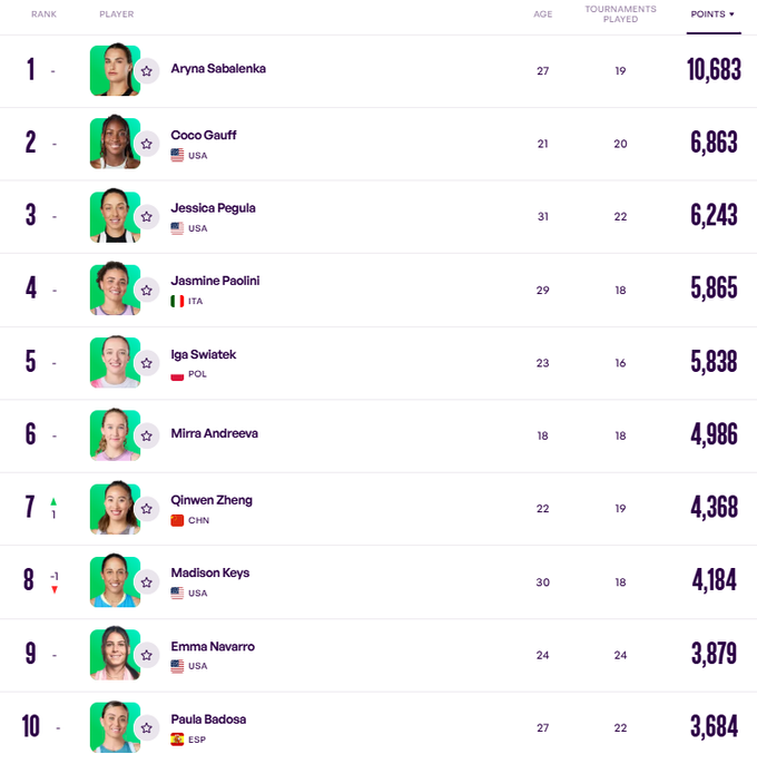 Из изменений в топ-10: Чжэн Циньвень обошла Мэдисон Киз. Китаянка теперь седьмая, а американка – восьмая.