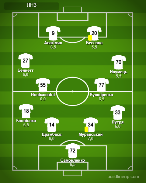 ЛНЗ: Самойленко – Каплиенко, Драмбаев, Муравский, Путря (Танковский, 46) – Беннетт (Благодарный, 81), Ноникашвіли, Кушниренко, Наумец (Г. Пасич, 54) – Авагимян (Яшари, 90+2), Бессала (Макуана, 46)