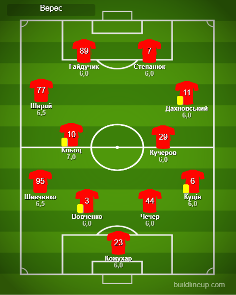 «Верес»: Кожухарь – Шевченко, Вовченко, Чечер, Куция (Протасевич, 74) – Шарай (Лепский, 83), Клёц, Кучеров (Годя, 83), Дахновский (Смиян, 74) – Гайдучик, Степанюк