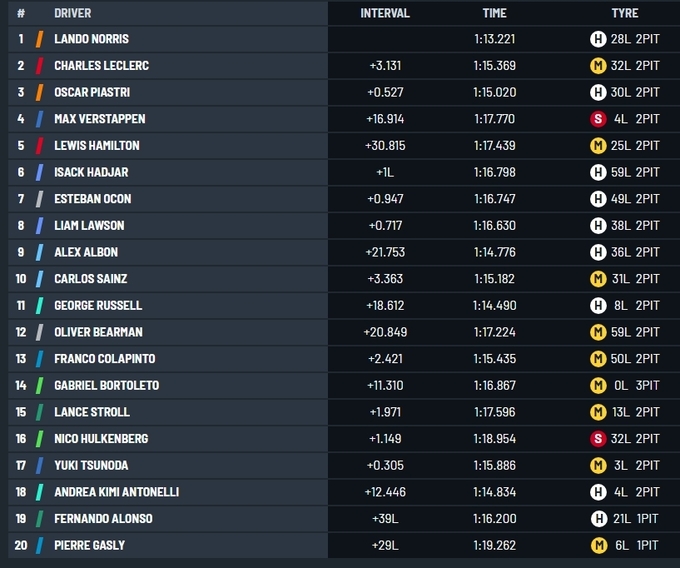 Топ-3 замкнули Шарль Леклер на Феррари и Оскар Пиастри на Макларене. Ландо в общем зачете отыграл у Пиастри 10 очков и теперь отстает лишь на три пункта.