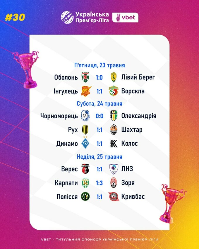 В воскресенье, 25 мая, состоялись три заключительных поединка последнего 30-го туре Украинской Премьер-лиги 2024/25.