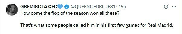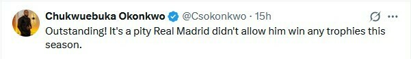 Chukwuebuka Okonkwo: Великолепно! Жаль, что «Реал» Мадрид не позволил ему выиграть ни одного трофея в этом сезоне.
