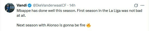 Vandi: Мбаппе хорошо выступил в этом сезоне. Первый сезон в Ла Лиге был совсем не плох. Следующий сезон с Алонсо будет огненным.