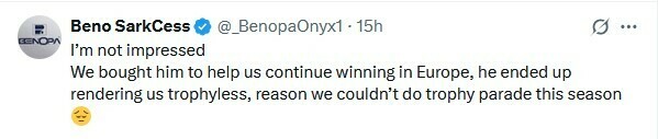 Beno SarkCess: Я не впечатлен. Мы купили его, чтобы он помог нам продолжать побеждать в Европе, но в итоге он лишил нас трофеев, поэтому мы не смогли провести парад трофеев в этом сезоне.