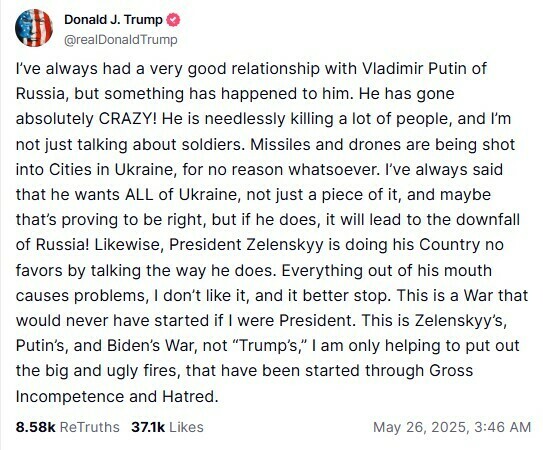 Президент США Дональд Трамп в соцсети Truth Social прокомментировал последние ракетные обстрелы Украины со стороны рашистской федерации: