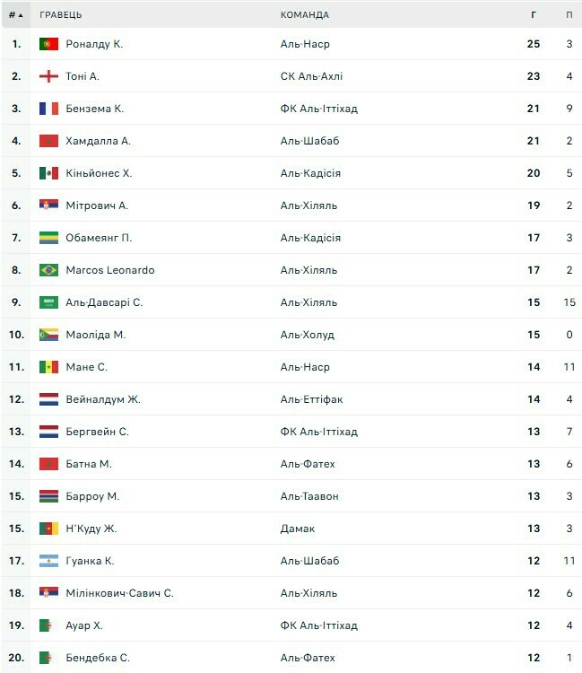 Лучшие бомбардиры сезона: Криштиану Роналду (Аль-Наср) – 25 мячей, Айвен Тоуни (Аль-Ахли) – 23, Карим Бензема (Аль-Иттихад) и Абдерразак Хамдалла (Аль-Шабаб) – по 21.