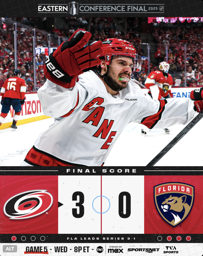 В четвертом матче полуфинала Кубка Стэнли Каролина Гаррикейнс на выезде победила Флориду Пантерс со счетом 3:0 и сократила отставание в серии (1-3).