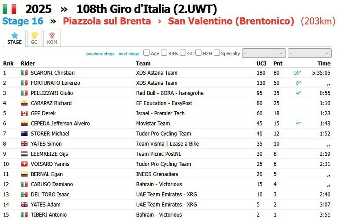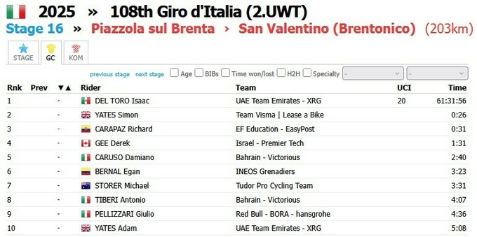 После шестнадцатого этапа лидером генеральной классификации остается Исаак Дель Торо. Саймон Йейтс отстает 26 секунд.