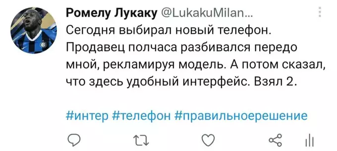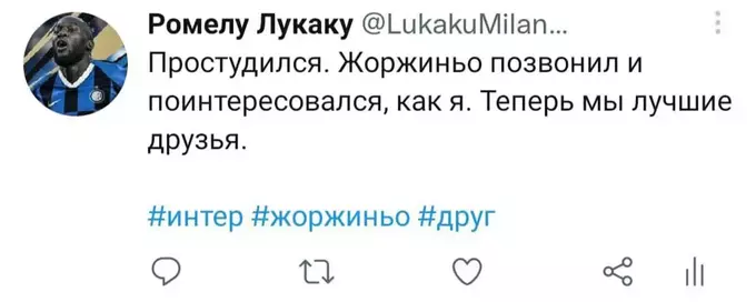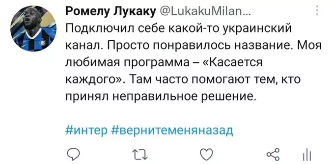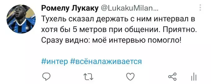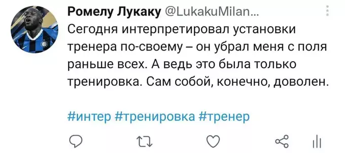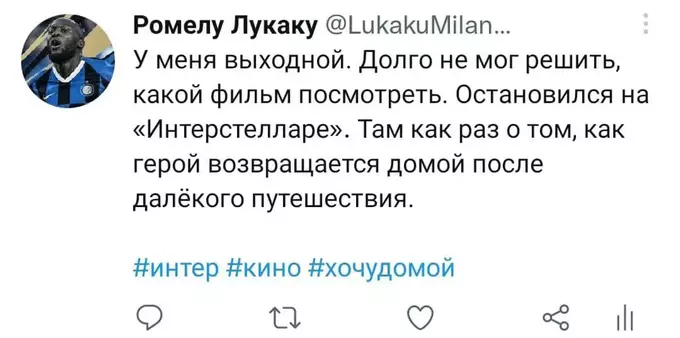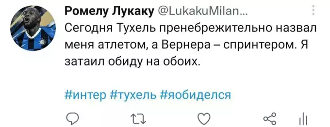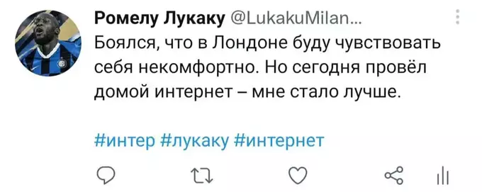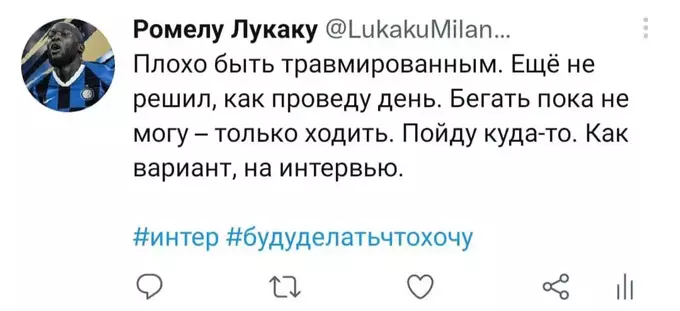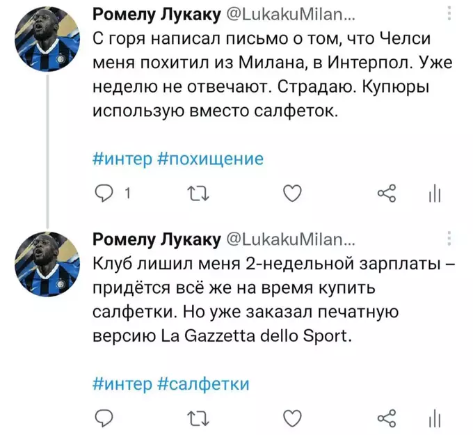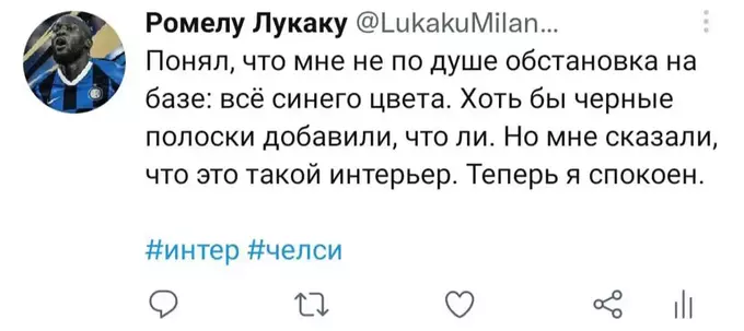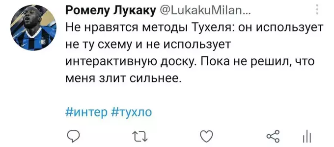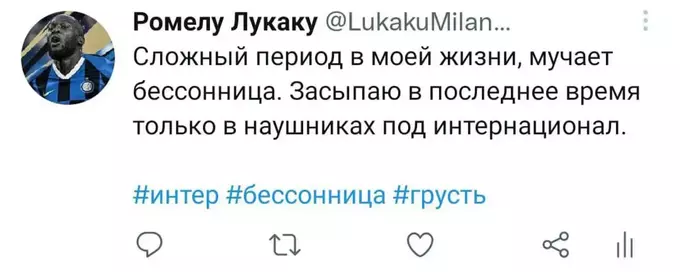 Я попытался представить, как Ромелу в свойственной для него манере вёл бы свой твиттер-аккаунт последние полгода. Никто не расскажет историю всех несчастий и душевных переживаний одного футболиста лучше, чем он сам. Судя по репликам в упомянутом выше интервью, игрок в беде: по-прежнему не смог обжиться в Лондоне и испытывает дискомфорт от пребывания в команде. Можно лишь предполагать, с какими проблемами столкнулся футболист в течение этого сезона. Собственно, этим мы и займёмся. Итак, предполагаемая история самого депрессивного периода карьеры Лукаку в формате его же твитов. Должно быть ИНТЕРестно. Особенно, если при чтении обращать внимание на «миланские» корни слов.