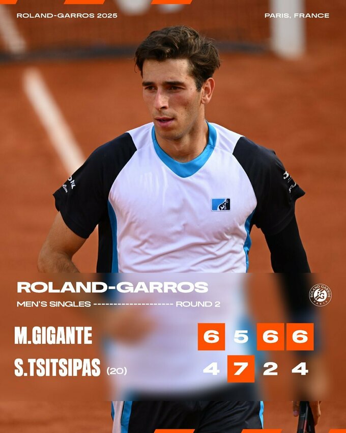 Греческий теннисист Стефанос Циципас (ATP 20) завершил выступление на Открытом чемпионате Франции 2025, который проходит на грунтовых кортах в Париже.