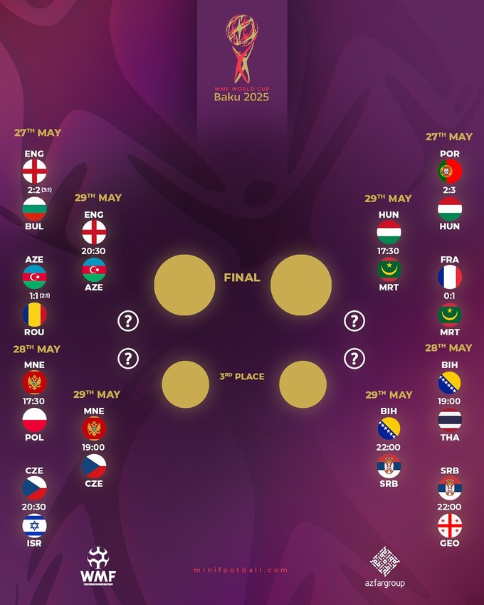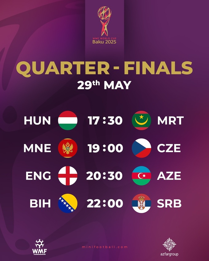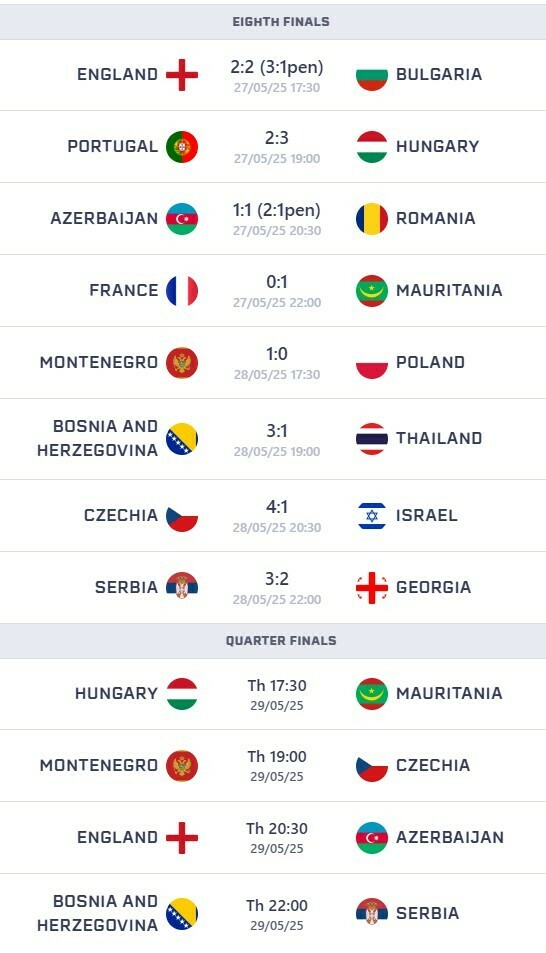 Определены пары 1/4 финала, матчи пройдут 29 мая: Венгрия – Мавритания, Черногория – Чехия, Англия – Азербайджан, Босния и Герцеговина – Сербия.