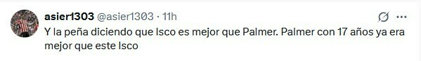 asier1303: И люди говорят, что Иско лучше Палмера. Палмер уже был лучше этого Иско в 17 лет.
