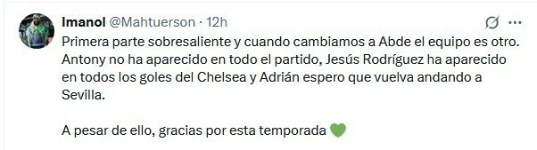 Imanol: Выдающийся первый тайм, и когда мы заменили Абде, команда была другой. Антони вообще не появился, Хесус Родригес участвовал в каждом голе «Челси», и я надеюсь, что Адриан вернется в «Севилью». Несмотря на это, спасибо за этот сезон.