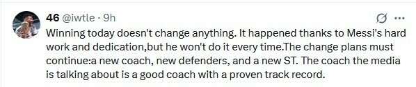 46: Сегодняшняя победа ничего не меняет. Это произошло благодаря упорному труду и самоотверженности Месси, но он не будет делать это каждый раз. Планы по переменам должны продолжаться: новый тренер, новые защитники и новая линия атаки. Тренер, о котором говорят СМИ, – хороший тренер с проверенной репутацией.