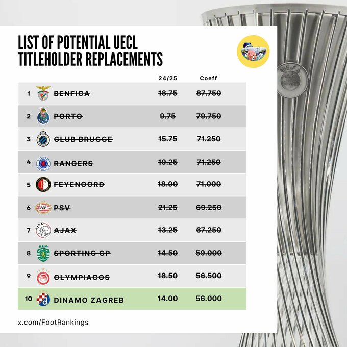 Однако победа Риеки в Кубке Хорватии позволила получить путевку в основу Лиги Европы именно Динамо Загреб – благодаря более высокому клубному рейтингу (56.000 против 52.000 у Шахтера). Этот ребаланс стал возможным из-за появления вакансии в основном раунде Лиги Европы. Английский Челси, выигравший Лигу конференций, параллельно завоевал место в Лиге чемпионов благодаря 4-му месту в АПЛ.