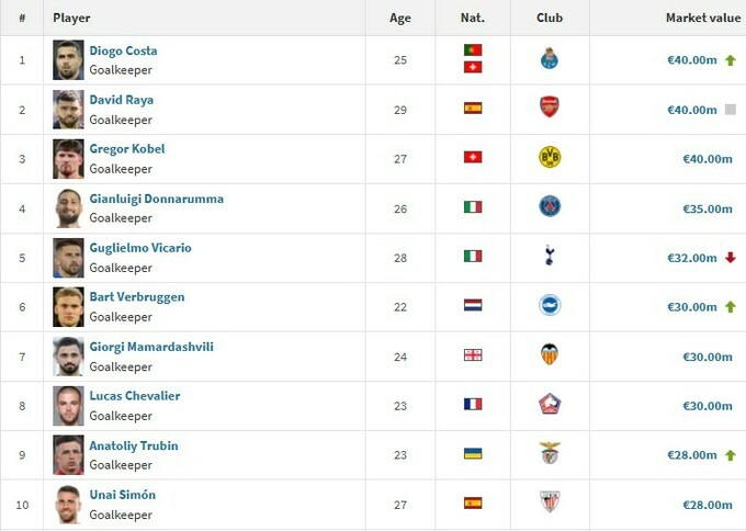 Топ-10 вратарей мира по трансферной стоимости (Transfermarkt)