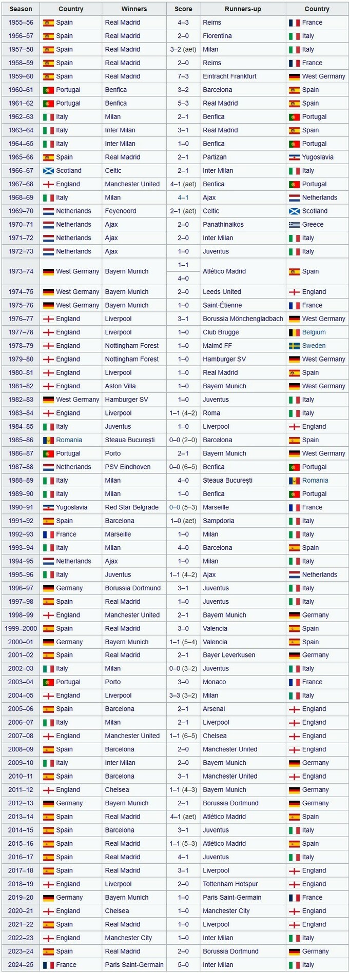 Финалы Лиги чемпионов (КЕЧ) за всю историю