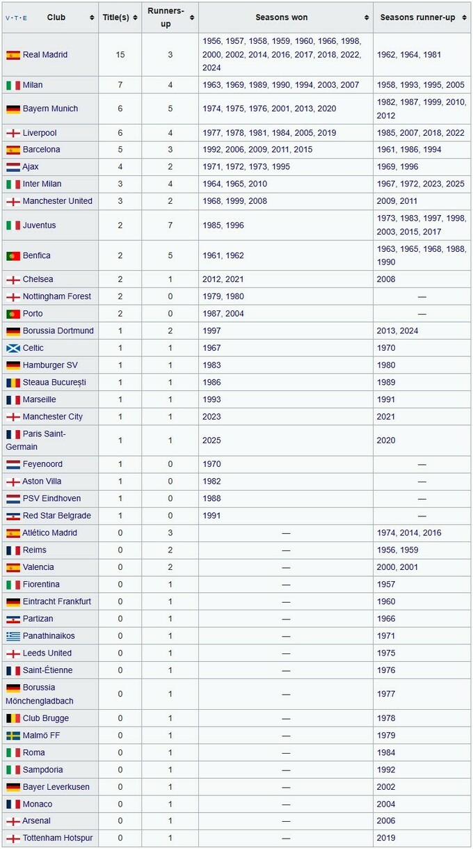 Лидеры по количеству трофеев ЛЧ: Реал (15), Милан (7), Бавария, Ливерпуль (по 6), Барселона (5), Аякс (4), Интер, Ман Юнайтед (по 3).