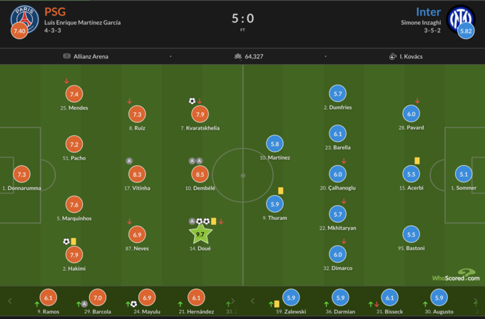 Худшую оценку в матче получил голкипер итальянской команды Ян Зоммер. По версии издания WhoScored у него 5,1 балла за игру в финале.