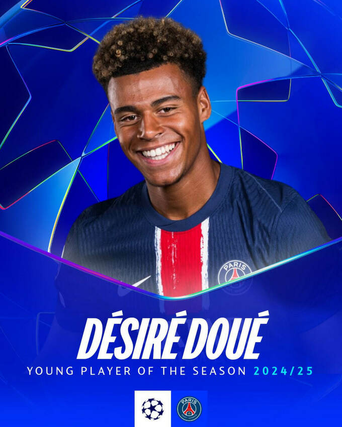 19-летний французский вингер ПСЖ Дезире Дуэ стал лучшим молодым игроком Лиги чемпионов 2024/25 по версии УЕФА.