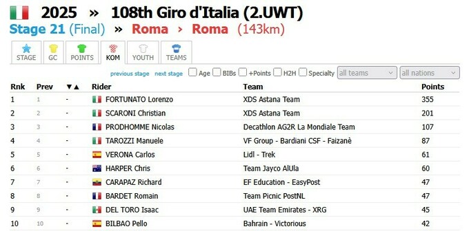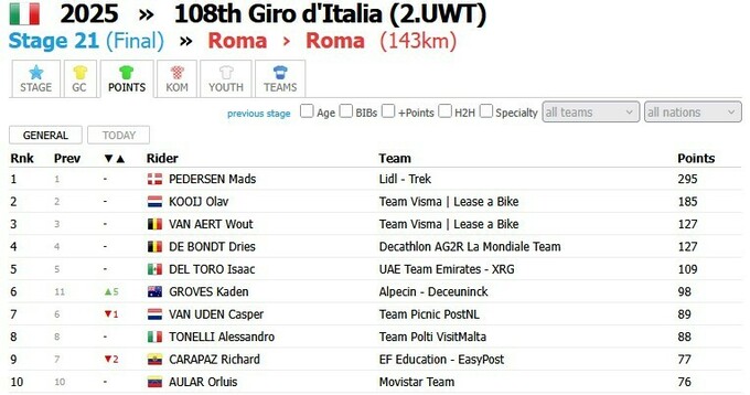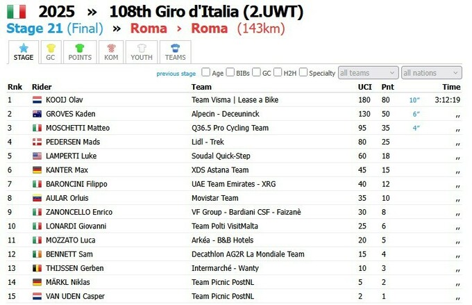 В воскресенье, 1 июня, прошел 21-й этап шоссейного гранд-тура Giro d'Italia 2025. Победу одержал представитель команды Team Visma Lease a Bike Олаф Кой.