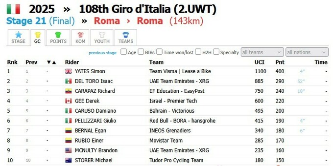 Победителем в генеральной классификации Giro d'Italia 2025 стал Саймон Йейтс. Второй результат у Исаака Дель Торо. Третье место занял Ричард Карапас.