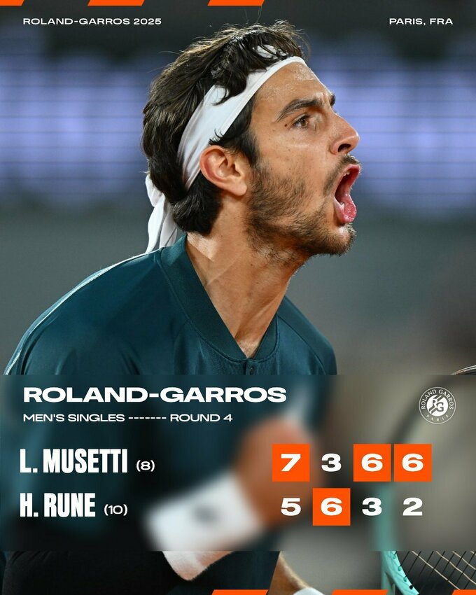 Итальянский теннисист Лоренцо Музетти (ATP 7) вышел в четвертьфинал Открытого чемпионата Франции 2025, который проходит на грунтовых кортах в Париже.