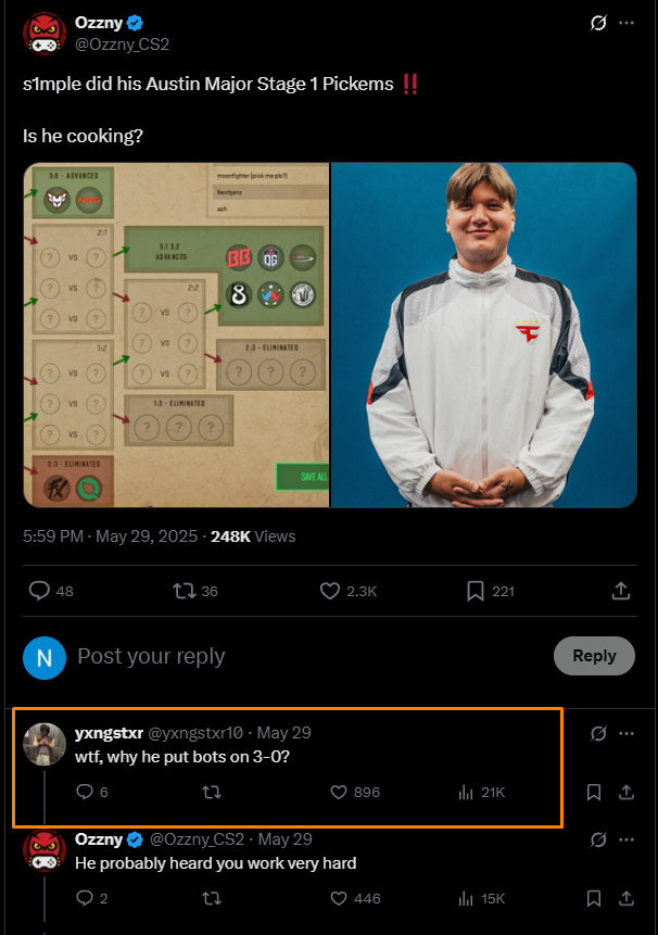 В конце мая, s1mple делал прогнозы (Пикем) на первую стадию Мейджора и поставил HEROIC на 3:0 – проход в следующий этап без поражений. Игрок датского клуба – yxngstxr отреагировал и удивился, почему s1mple так высоко оценил «ботов» с HEROIC.