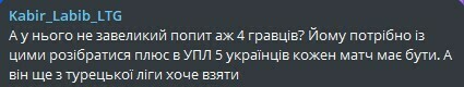 Kabir_Labib_LTG: А у него не большой спрос аж 4 игрока? Ему нужно с этими разобраться плюс в УПЛ 5 украинцев каждый матч должен быть. А он еще из турецкой лиги хочет взять.