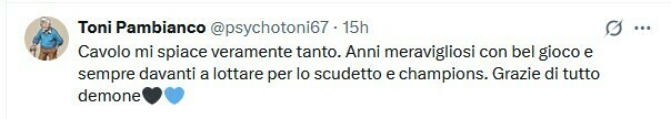Toni Pambianco: Черт, мне правда жаль. Чудесные годы с хорошей игрой и всегда впереди, борьба за скудетто и Лигу чемпионов. Спасибо за все, Демон🖤💙
