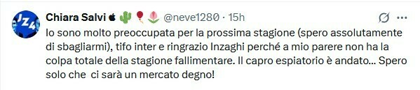 Chiara Salvi: Я очень переживаю за следующий сезон (надеюсь, что я ошибаюсь), я болельщик «Интера» и благодарю Индзаги, потому что, по моему мнению, он не полностью виноват в провале сезона. Козел отпущения исчез... Я только надеюсь, что будет достойный трансферный рынок!