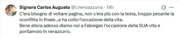 Signora Carlos Augusto: Нужно было перевернуть страницу, поражение в финале было слишком тяжелым... и он ухватился за возможность всей жизни. Ну что ж, давайте дадим Фабрегасу возможность всей его жизни и приведем его в «нерадзурри».