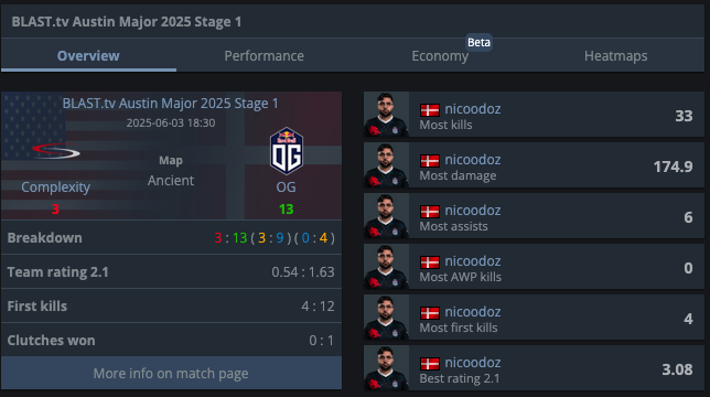 Игрок OG Нико «nicoodoz» Тамджиди установил новый рекорд мейджора по CS2, показав рейтинг 3.08 в матче против Complexity на карте Ancient. OG разгромили соперника со счетом 13:3, при этом Complexity играли без Хокона «hallzerk» Фьэрли.