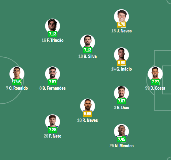 Португалия: Диогу Кошта, Жоау Невеш, Рубен Диаш, Инасиу, Нуну Мендеш, Рубен Невеш, Бернарду Силва, Тринкау, Бруну Фернандеш, Педру Нету, Криштиану Роналду