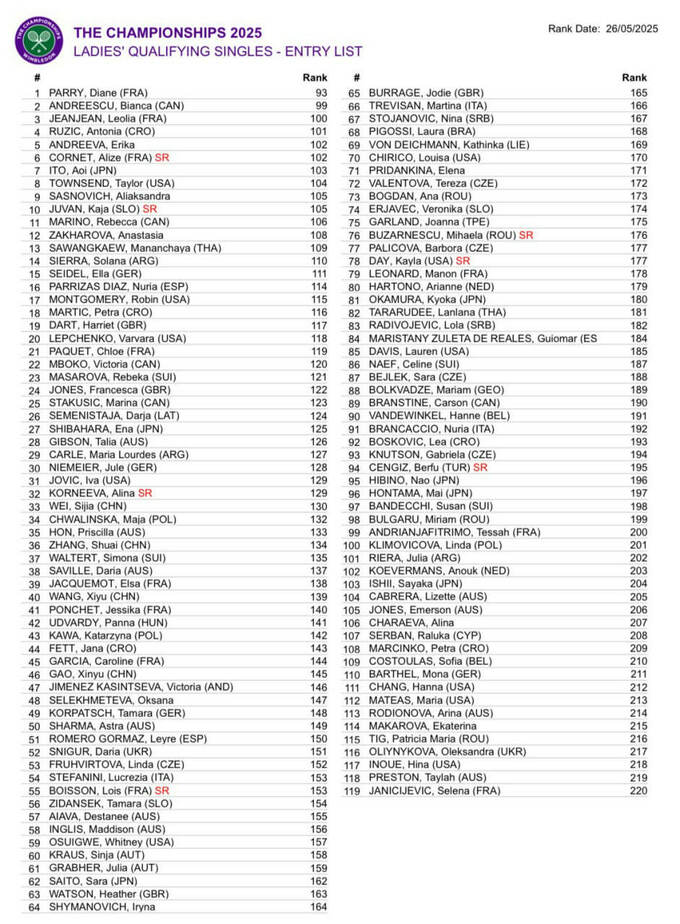 Также отметим, что в отборе к Уимблдону заявлена полуфиналистка Ролан Гаррос Лоис Буасон (WTA 361), которая воспользовалась защищенным рейтингом, но с понедельника дебютирует в топ-70. Вполне возможно, что она будет единственной теннисисткой из первой сотни в квалификации Уимблдонского турнира (Диан Парри и Бьянка Андрееску, с высокой вероятностью, зайдут в основу).