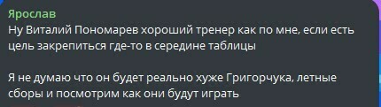 Ярослав: Ну Виталий Пономарев хороший тренер как по мне, если есть цель закрепиться где-то в середине таблицы. Я не думаю что он будет реально хуже Григорчука, летние сборы и посмотрим как они будут играть.