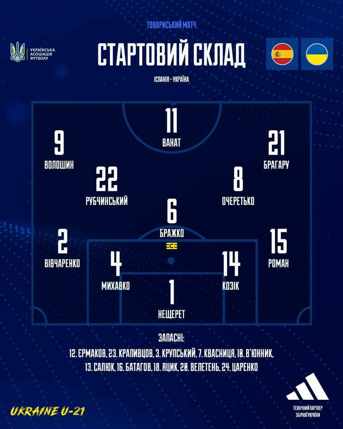 Украина U-21: Нещерет, Вивчаренко, Михавко, Козык, Роман, Бражко, Волошин, Рубчинский, Очеретько, Брагару, Ванат.