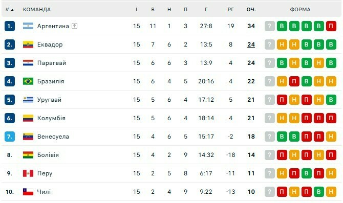 Турнирное положение: Аргентина (34 очка), Эквадор, Парагвай (по 24), Бразилия (22), Уругвай, Колумбия (по 21), Венесуэла (18), Боливия (14), Перу (11), Чили (10).