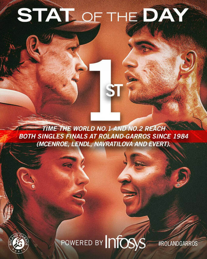 Впервые с 1984 года финалах на Открытом чемпионате Франции 2025 в мужском и женском одиночном разрядах сыграют первые и вторые ракетки мира.