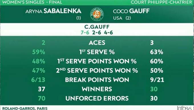 Коко провела 11-е очное противостояние против Соболенко. Американка выиграла шестую личную встречу.