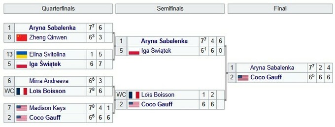 Арина Соболенко [1] – Коко Гауфф (США) [2] – 7:6 (7:5), 2:6, 4:6